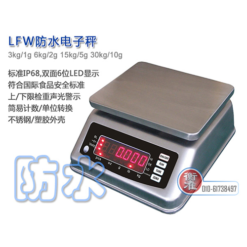 北京衡准防水电子秤符合国家计量检定标准。防水秤量程:3~30kg,特殊规格可根据客户要求加工定制。防水电子秤适用于食品加工车间,化工业,水产市场等部门,从而快速测定物体质量,大大提高了企业的工作效率。由于本产品规格型号众多,具体参数请联系北京衡准。如产品发生变动,以实际产品为准。
