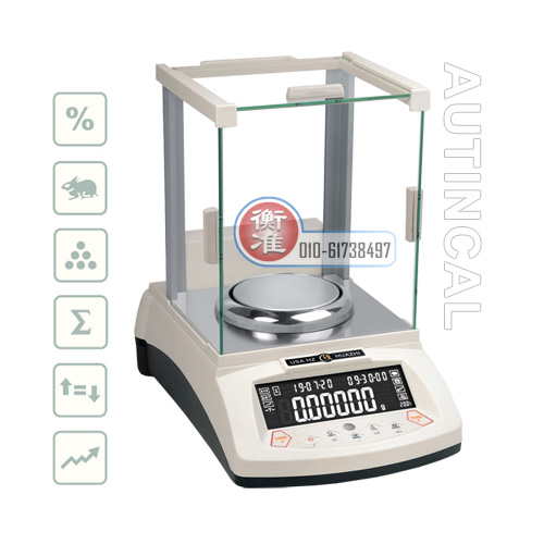 四级防震滤波可调功能内置砝码自动校准称重稳定时间可调功能具有克、克拉、英镑、盎司等多种国际单位设定物体称量计数功能百分比称重,上下限检重报警功能内置温度显示功能。超大LCD界面带背光显示锁定当前工作模式/单位功能配备RS232/USB通讯接口连接外围设备内置时间日期可调功能内置下挂钩装置数字化多点线性校准功能人性化工具箱,可放置砝码等常用操作用品。